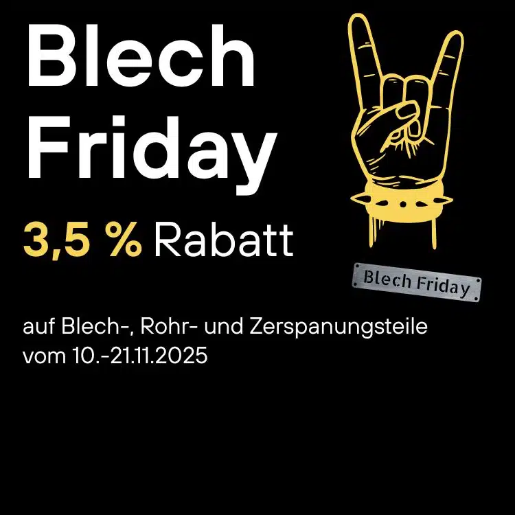 Nutzen Sie diese exklusiven Rabatte und profitieren Sie von Zuverlässigkeit, Effizienz und günstigen Preisen. Bei der Bestellung während der Blech Friday Wochen ist die Lieferung Ihrer Metallteile noch in diesem Jahr möglich.