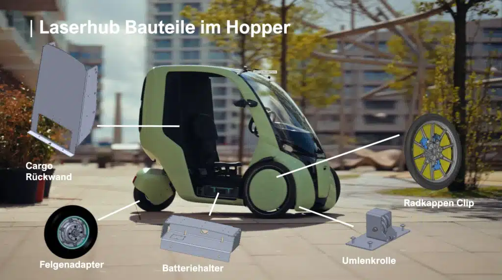 Der Hopper ist ein komplettes, überdachtes Fahrzeug. Neben Antrieb und Fahrradtechnik entstehen zahlreiche Komponenten für Sitze, Fahrwerk und Karosserie. Besonders im Metallbereich ist die Bandbreite groß: unterschiedliche Materialdicken, verschiedene Beschichtungen, komplexe Geometrien und mehrere Fertigungsverfahren.