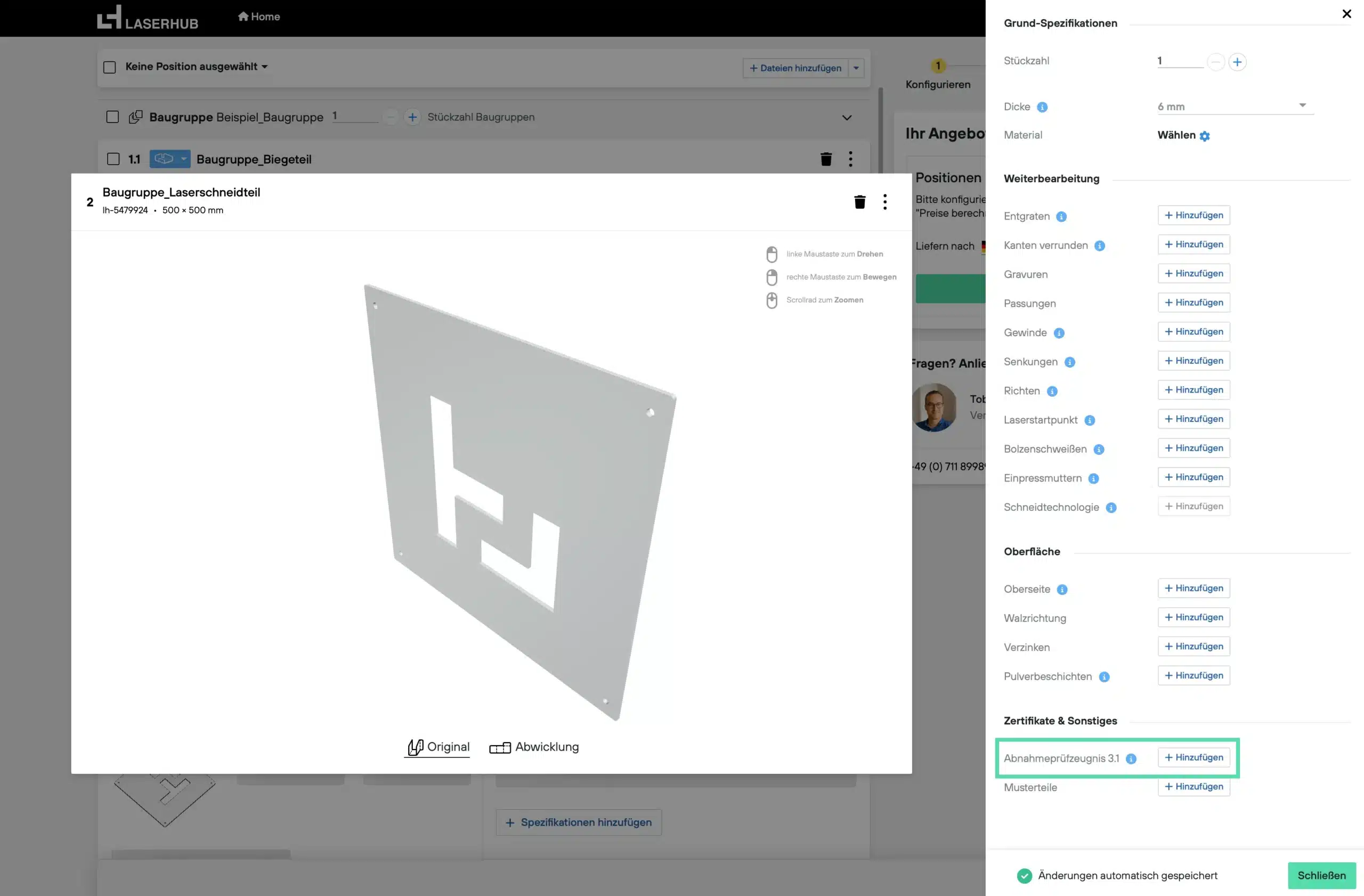Abnahmeprüfzeugnis 3.1 bei Laserhub