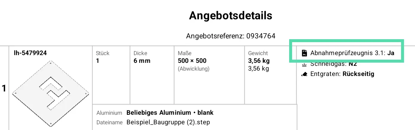 Für verschiedene Fragen und Nachweispflichten benötigen Sie eine rechtsverbindliche Bescheinigung. Daher bieten wir Ihnen das Abnahmeprüfzeugnis 3.1(Apz 3.1) nach DIN EN 10204 an. Ihr Abnahmeprüfzeugnis kann im Bestellvorgang auf der Laserhub Plattform einfach durch ein zusätzliches Häkchen während des zweiten Kalkulationsschrittes mitbestellt werden.