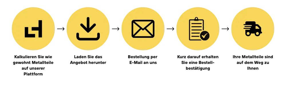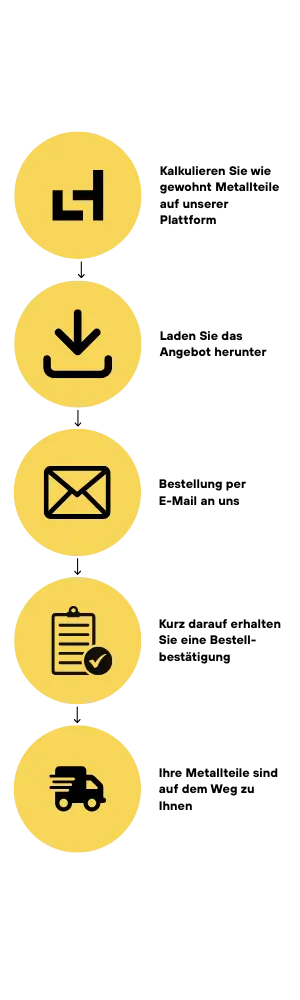 Laserhub passt sich Ihrem Beschaffungsprozess von Metallteilen an: Schnell, zuverlässig und 100 % prozesskonform. Schicken Sie uns Ihre Bestellung ganz einfach per Mail an service@laserhub.com – ohne Umwege, ohne neue Prozesse.