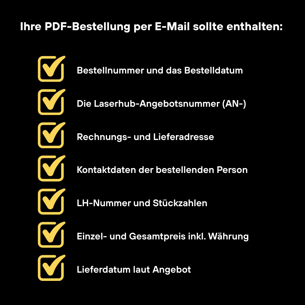 Damit Ihre Bestellung per E-Mail an service@laserhub.com ohne Verzögerung bearbeitet werden kann, ist es wichtig, dass das beigefügte PDF alle erforderlichen Informationen enthält. Nur wenn diese Angaben vollständig vorliegen, können wir Ihre Bestellung eindeutig zuordnen, korrekt prüfen und Ihnen direkt eine Bestellbestätigung zusenden. Fehlen einzelne Punkte, führt das zu Rückfragen und verlängert den Prozess. Achten Sie daher darauf, dass Ihr PDF alle wesentlichen Bestelldetails beinhaltet – so stellen Sie sicher, dass Ihr Auftrag schnell und reibungslos in die Produktion geht.